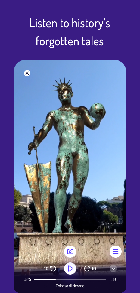 A virtual narrator guides you through dramatic tales of power, betrayal, and daily life in ancient Rome. Choose your language: English, Italian, or Spanish. Perfect for history lovers who hate boring audio guides.